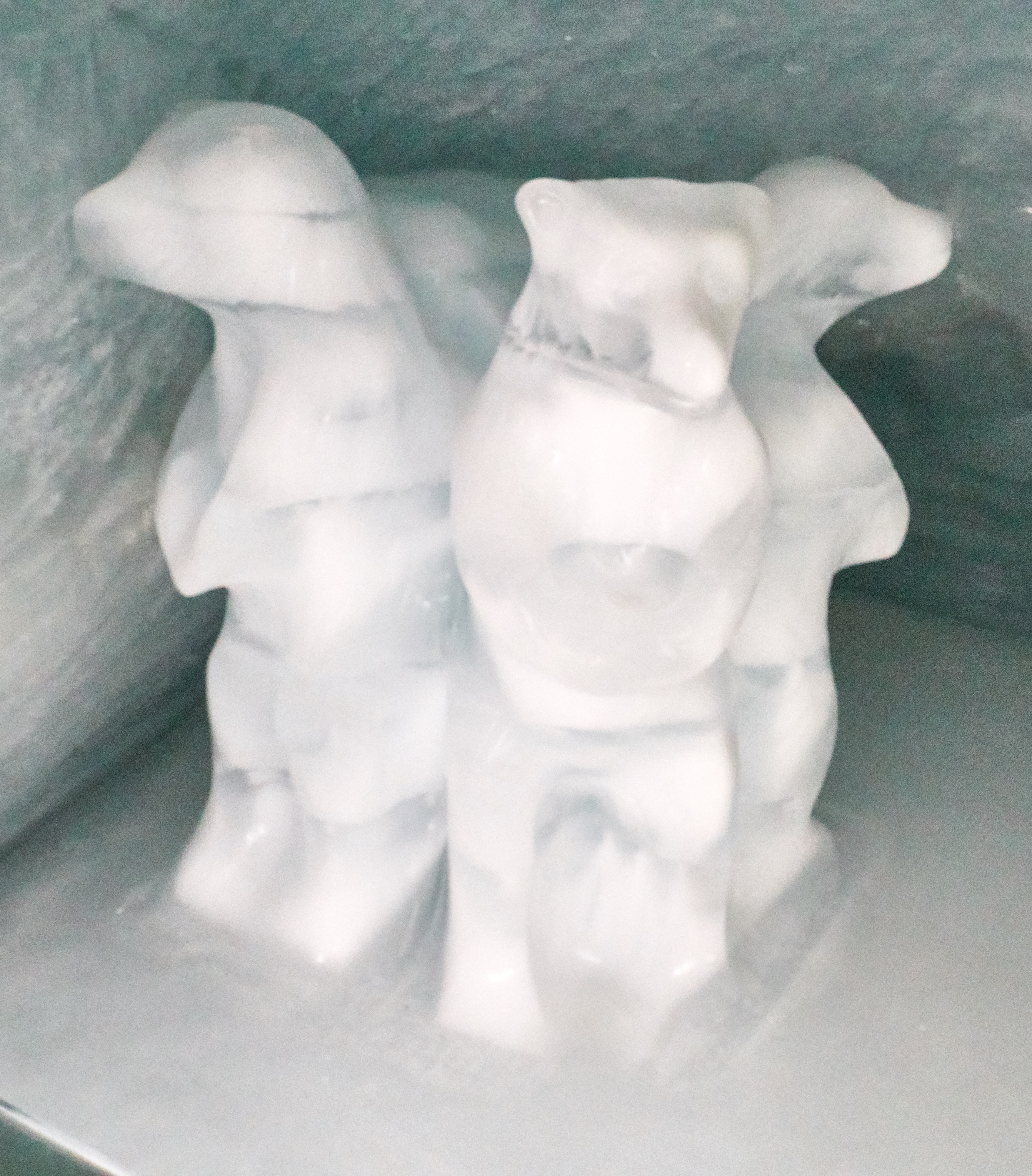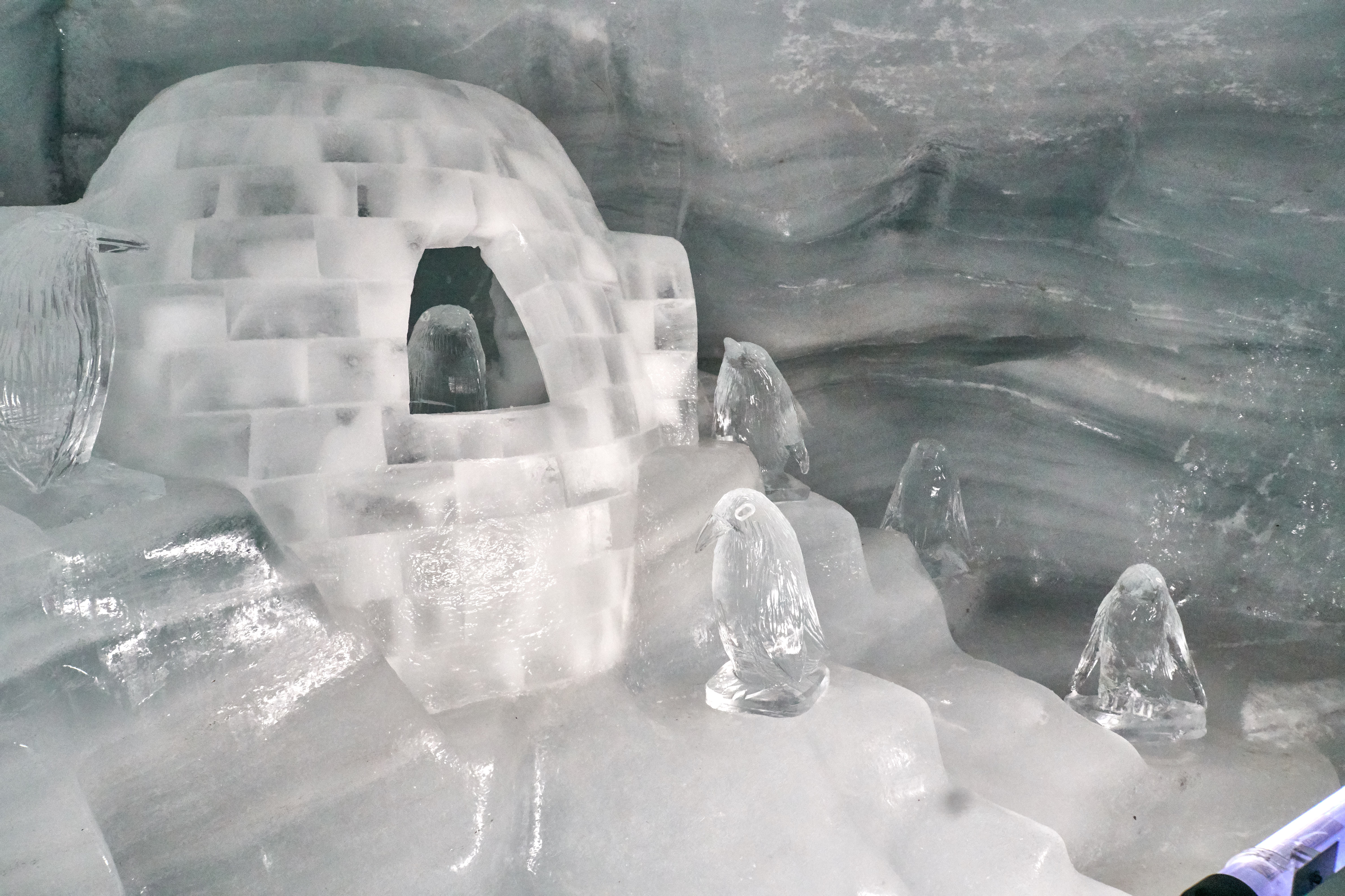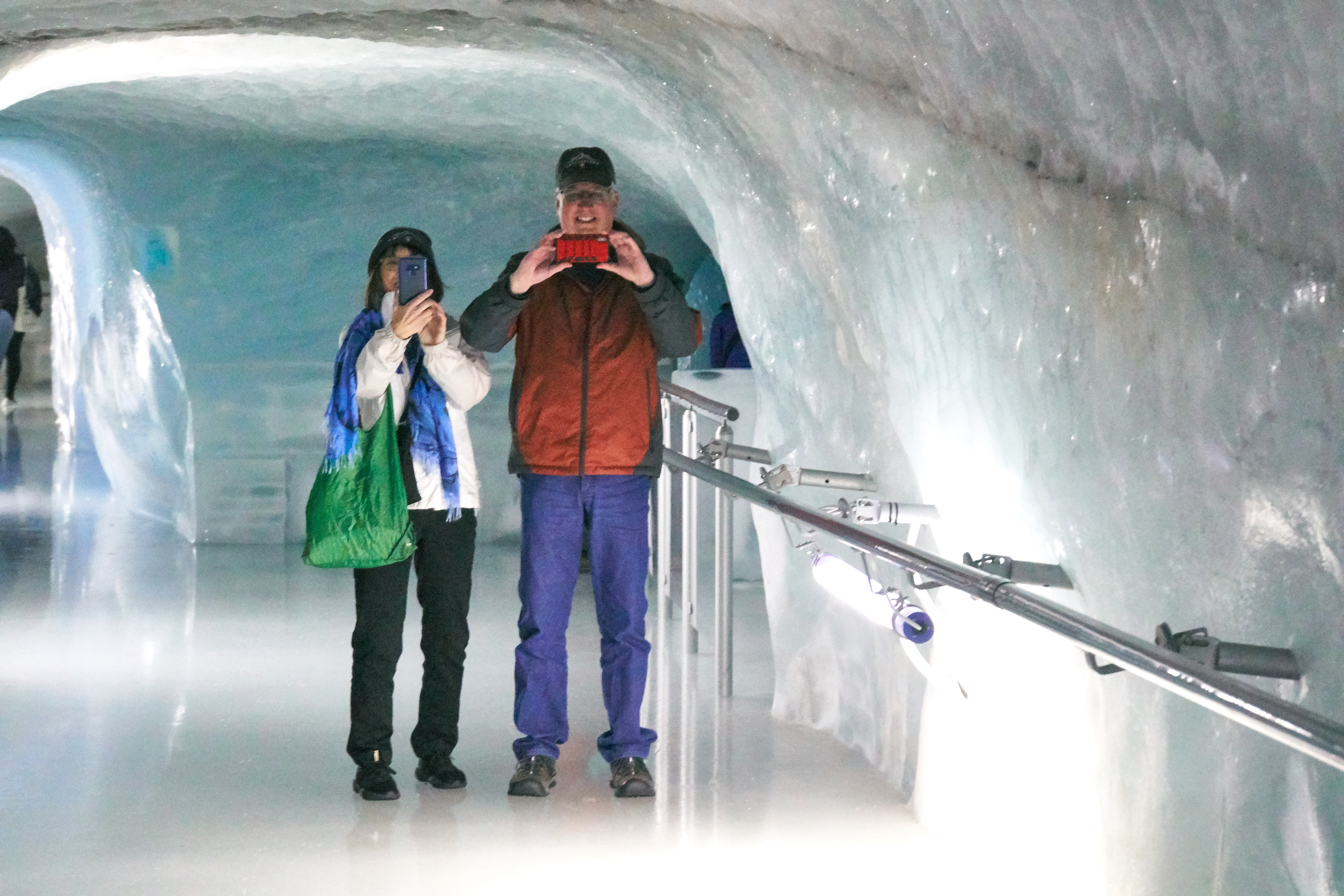 One of the fun things to do at Jungfraujoch is to visit the Ice Palace. It’s a maze of twisty passages, with ice floors, ice walls and ceilings, and lots of fun ice sculptures. The floor is treated somehow, so we don’t slip, and the sculptures display a sense of humor.